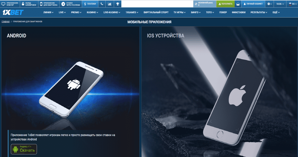 Делать ставки, просматривать матчи можно не только на основном сайте. Компания предлагает мобильную версию сайта 1хбет. Она запускается на любом устройстве в браузере, внешний вид ничем не отличается от десктопного варианта. Однако существует ещё более удобный вариант — скачать 1xbet приложение. Его предлагают установить сразу с сайта, оно работает на устройствах Android и iOS. Дизайн программы имеет упрощенную форму, где есть самые основные функции и разделы. При этом искать рабочее зеркало игрокам не придется. Используя мобильное приложение, Вы никогда не столкнётесь с проблемой блокировок основных доменов БК.